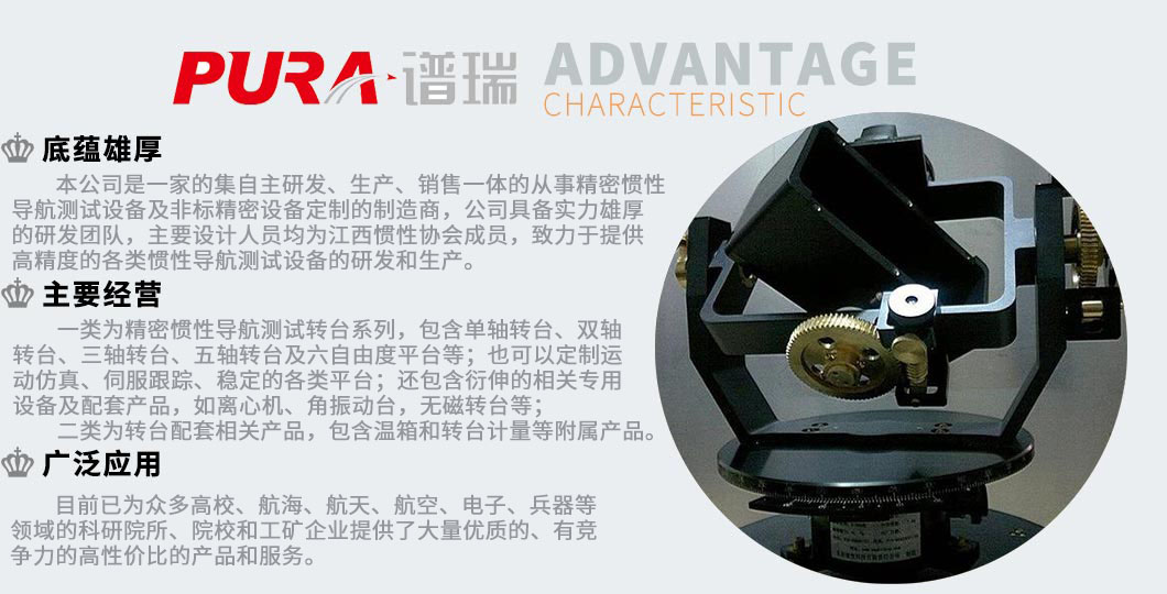 公司主要优势在精密加工、精密测量、精密设备。公司产品主要为精密惯性导航测试转台系列,包含单轴转台、双轴转台、三轴转台、五轴转台及六自由度平台等;也可以定制运动仿真、伺服跟踪、稳定的各类平台。目前已为众多高校、航海、航天、航空、电子、兵器等领域的科研院所、院校和工矿企业提供了大量的、有竞争力的高性价比的产品和服务。