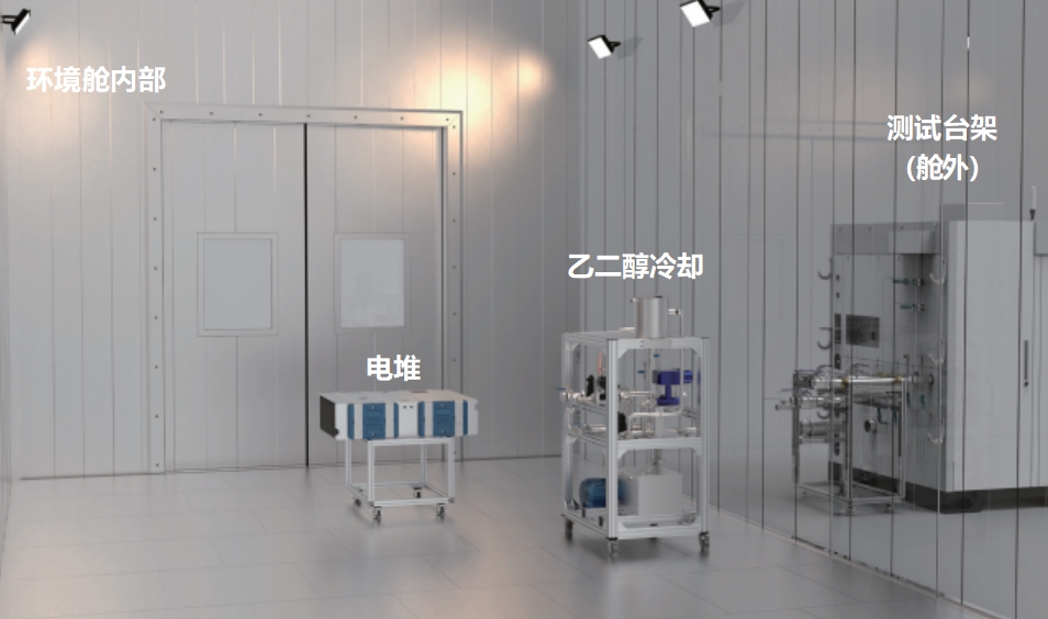 乙二醇小循环系统在电堆低温冷启动测试过程中可为电堆提供一个温度、流量、压力可控的冷却循环回路,使电堆在低温环境 下安全启动,以此来评估电堆冷启动性能、稳定性、可靠性。